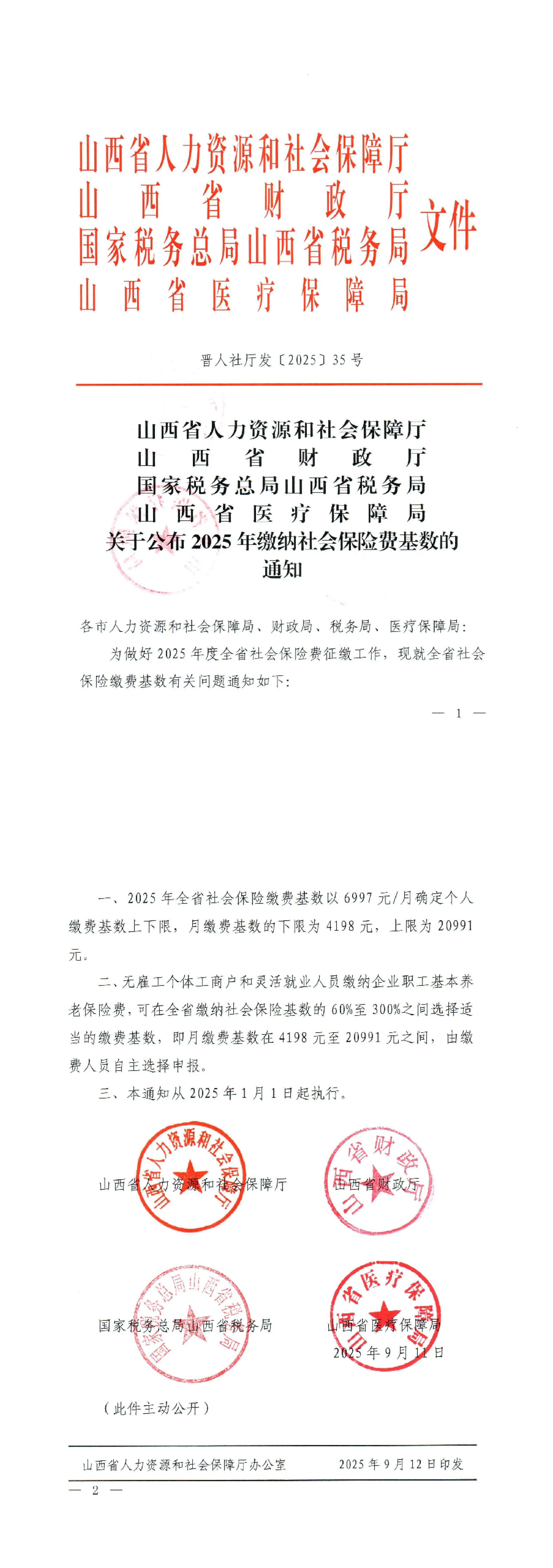 一、2025年全省社会保险缴费基数以6997元/月确定个人缴费基数上下限,月缴费基数的下限为4198元,上限为20991元。